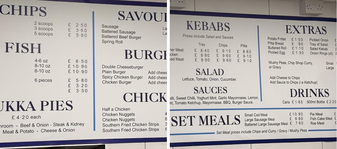 My local chippy and didn't the village need it?!!! Chips are always delicious, I have chicken kebab every time and am never disappointed. Friendly staff and not awkward waiting for food to cook if there is a queue. It's worth the wait.